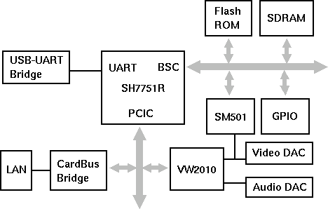 Figure 2 shows the block diagram of the WPAR01. The SH7751R (Renesas) is a 32 bit RISC microprocessor. It consists of the SH-4 CPU working at 240MHz, MMU, PCI bus controller, and BSC. Those built-in functions lead to lower system costs. A flash ROM for file system, SDRAM for main memory, graphic controller, and GPIO are connected to the local bus, while a video codec LSI and CardBus bridge are connected to the PCI bus. Finally, it is equipped with a USB-UART bridge for a serial console.