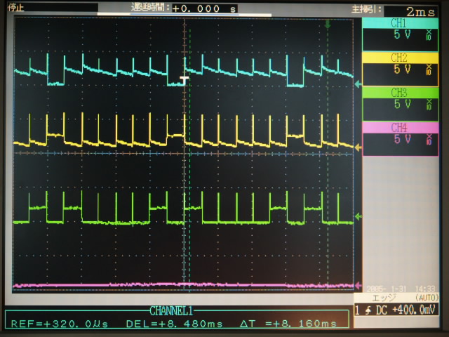 - LEDドライブ時の波形。[CH1]コモン、[CH2]a2(プルダウン無し、点灯)、[CH3]b2(プルダウン有り、消灯)。