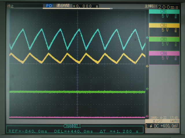 - −5V〜5Vの入力電圧(青線)を0〜5Vに変換(黄色)している(反転しちゃうけど)。